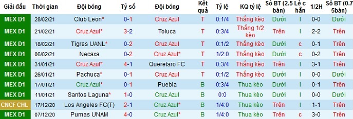 + Thống kê 10 trận gần nhất của Cruz Azul