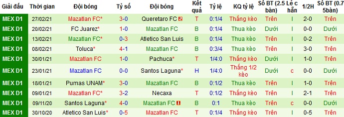 + Thống kê 10 trận gần nhất của Mazatlán