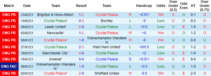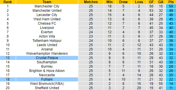Crystal Palace đang xếp thứ 13 trên bảng xếp hạng Premier League 2020/21 với 32 điểm sau 25 trận. Trong khi đó với số trận tương tự, Fulham mới giành được 22 điểm, xếp ở vị trí thứ 18. 3 trận đối đầu Fulham gần đây, Crystal Palace toàn thắng, ghi 6 bàn và chỉ 1 lần để thủng lưới. Cùng với việc được chơi trên sân nhà, Crystal Palace cho thấy họ xứng đáng được đánh giá cao hơn đối thủ.