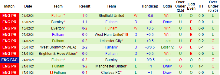 + Thống kê 10 trận gần nhất của Fulham