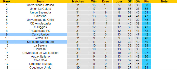 Mọi chuyện càng thêm khó khăn khi đối thủ của Curico Unido là đối thủ cạnh tranh trực tiếp top 8 Santiago Wanderers. Nếu xét về phong độ, Santiago Wanderers để lại ấn tượng mạnh hơn khi thắng 3, hòa 2 và chỉ thua 2 lần ở 7 vòng đấu gần nhất.