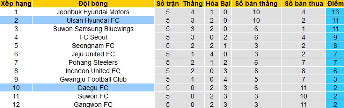 Bảng xếp hạng K-League trước vòng 6