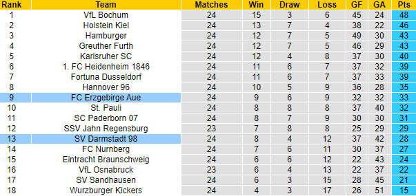 Vậy nhưng vào thời điểm hiện tại thì đôi bên không có sự khác biệt quá nhiều, Darmstadt thậm chí còn đang đứng dưới đối thủ. Thầy trò Anfang hiện xếp thứ 13 với 28 điểm, còn Aue xếp trên 4 bậc với 5 điểm nhiều hơn. Khoảng cách giữa đôi bên với top 3 là khá lớn, và cả 2 gần như không có hy vọng thăng hạng.