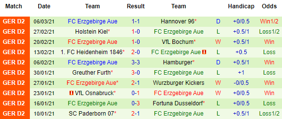 + Thống kê 10 trận gần nhất của Erzgebirge Aue