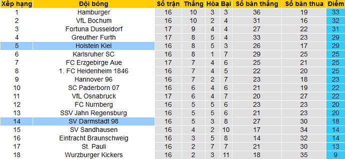 Ngược lại Holstein Kiel lại đang chơi rất tiến bộ trong mùa bóng này. Nếu như ở mùa trước Holstein Kiel chỉ về đích ở vị trí thứ 11 thì hiện tại đội bóng đang đứng thứ 5 trên bảng xếp hạng với 29 điểm sau 16 vòng đấu. Không những thế Holstein Kiel chỉ đang kém đội thứ ba có 2 điểm và đang thi đấu ít hơn 1 trận.