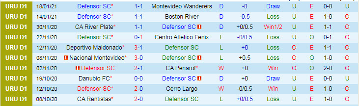 + Thống kê 10 trận gần nhất của Defensor Sporting