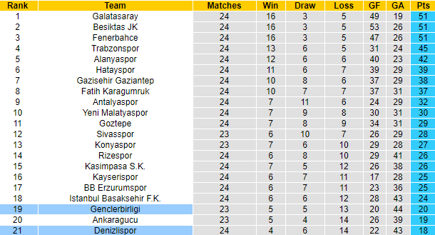 Sau 24 vòng đấu tại giải VĐQG Thổ Nhĩ Kỳ mùa này, Denizlispor mới giành được 18 điểm, xếp ở vị trí đội sổ trên bảng xếp hạng. Trong khi đó sau 23 trận, Genclerbirligi đã giành được 20 điểm, xếp trên đối thủ 2 bậc. Thế nhưng ở trận đấu sắp tới, nhà cái vẫn để Denizlispor chấp -1/4 theo kèo châu Á, kèo chính sau đó sớm được đổi thành 0:1/2.