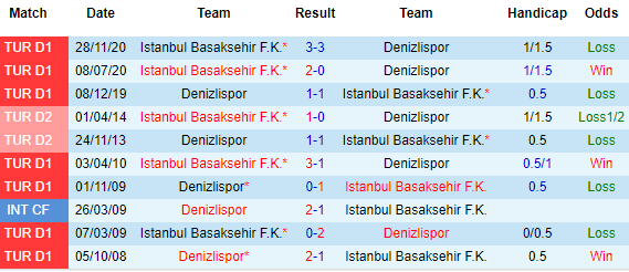 + Lịch sử đối đầu Denizlispor vs Istanbul Basaksehir