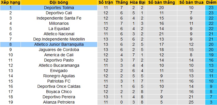 Trong khi đó Junior Barranquilla đang đứng cuối cùng trong nhóm các đội có suất dự vòng chung kết ở vị trí thứ 8 với 20 điểm nhưng đã thi đấu 13 trận. Hiện tại đội bóng cũng chỉ đang bằng điểm với đội đứng ngay sau và xếp trên nhờ hơn về hiệu số bàn thắng.