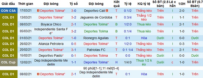 Tuy nhiên ở 5 trận đấu gần nhất Deportes Tolima chỉ có được 2 trận thắng, 1 trận hòa và để thua 2 trận, tính cả trận thắng tại Copa Sudamericana. Thế nhưng trên sân nhà thành tích của đội bóng lại đang rất ấn tượng khi chuỗi trận thắng đã kéo dài lên 8 trận liên tiếp, trên mọi mặt trận.