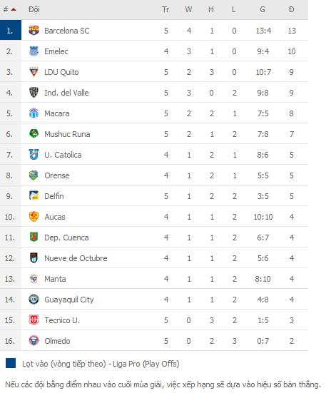 BẢNG XẾP HẠNG VĐQG Ecuador