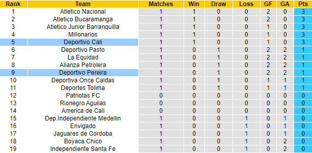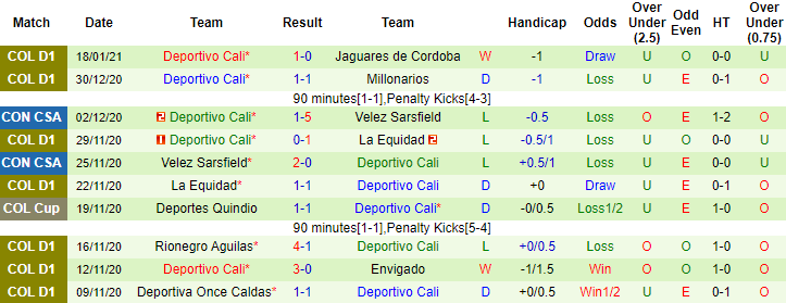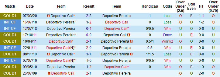Tính trên mọi đấu trường, 8 trận gần đây Deportivo Cali chỉ thắng được 1 trận, còn lại là 4 thất bại và 3 trận hòa. Trên sân khách, Deportivo Cali không biết đến mùi chiến thắng 5 trận liên tiếp vừa qua. Thế nhưng ở trận đấu sắp tới trên sân của Deportivo Pereira, Deportivo Cali vẫn được tin tưởng giành 3 điểm.