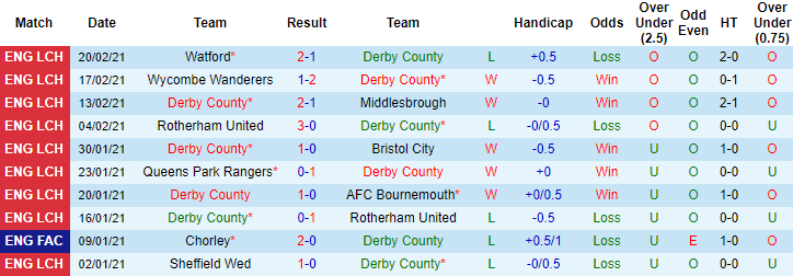 7 vòng đấu vừa qua tại giải hạng nhất Anh, Derby County giành chiến thắng 5 trận cả về tỷ số và kèo châu Á. Từ vị trí thứ 24 trên bảng xếp hạng, Derby County đã vươn lên xếp thứ 19 với 34 điểm sau 30 trận. Trong khi đó Huddersfield có 36 điểm sau 31 trận và liên tục gây thất vọng ở các chuyến làm khách. 10 trận xa nhà gần đây Huddersfield bất thắng với 7 thất bại và 3 trận hoà.
