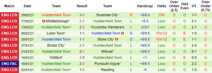 + Thống kê 10 trận gần nhất của Huddersfield
