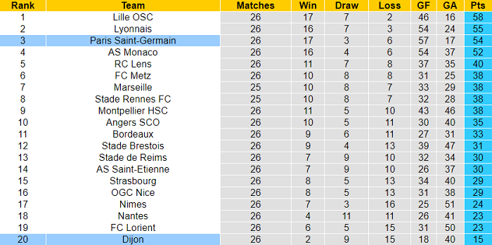 Thật vậy, Dijon có lẽ đang đếm ngược ngày trở lại Ligue 2. Thất bại với tỷ số 1-2 mới đây trước Lens đã là trận thua thứ 6 liên tiếp của Dijon tại Ligue 1. Họ chỉ thu về 15 điểm sau 26 vòng đấu, xếp cuối bảng và kém vị trí thứ 19 do Lorient nắm giữ tới 8 điểm.