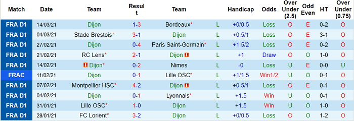 Mà những trận đấu gần đây giữa Dijon và Reims cũng thường xuyên xuất hiện các kết quả hòa. Cụ thể: họ chia điểm với nhau tới 3/4 lần so tài gần nhất thuộc khuôn khổ Ligue 1. Ở trận lượt đi mùa này, hai đội cũng hòa không bàn thắng trên sân của Reims.