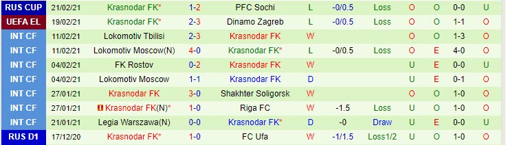 + Thống kê 10 trận gần nhất của Krasnodar