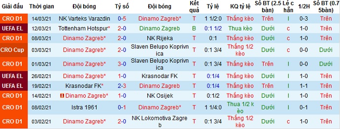 + Thống kê 10 trận gần nhất của Dinamo Zagreb