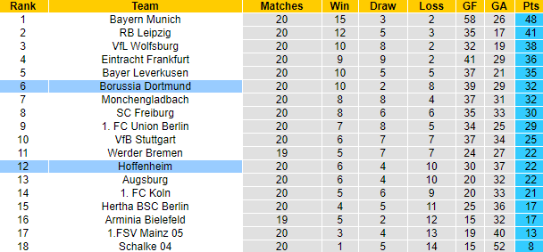 Trên bảng xếp hạng Bundesliga, Dortmund đang xếp trên Hoffenheim 6 bậc. Theo đó, Dortmund hiện xếp ở vị trí thứ 6 với 32 điểm sau 20 trận, Hoffenheim với số trận tương tự giành 22 điểm, xếp thứ 12.