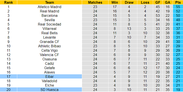 Với Eibar, thất bại mới đây trước Elche khiến họ không thể cải thiện vị trí. Eibar vẫn xếp thứ 17 trước khi vòng 25 khởi tranh và chỉ còn hơn nhóm ‘cầm đèn đỏ’ về chỉ số phụ.