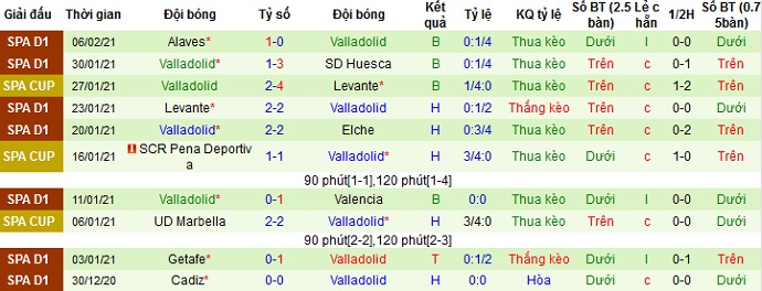 + Thống kê 10 trận gần nhất của Valladolid