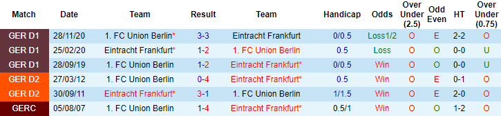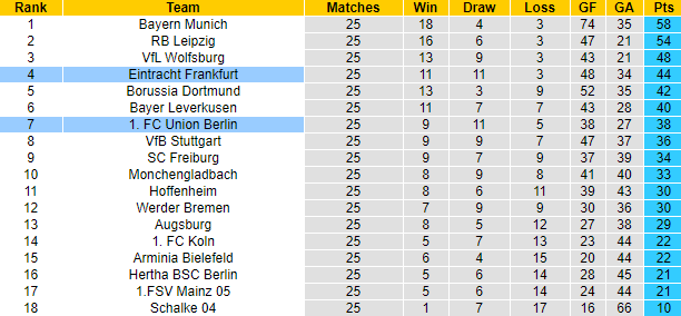 Union Berlin bất bại cả 2 trận đối đầu Eintracht Frankfurt gần đây với 1 chiến thắng và 1 trận hòa. Mùa giải trước khi làm khách trên sân của Eintracht Frankfurt, Union Berlin đã giành 3 điểm trọn vẹn với tỷ số chung cuộc 2-1 sau 90 phút. Tuy nhiên, ở lần tái đấu sắp tới, đội bóng thủ đô nước Đức lại sớm bị nghi ngờ vào khả năng có điểm.