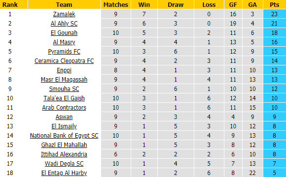 Sau hơn 1/4 chặng đường, El Gouna đang đứng thứ 3 và rộng cửa giành vé dự các Cúp châu Phi. Khoảng cách giữa họ và đối thủ xếp thứ 2 chỉ là 3 điểm, nhưng lưu ý rằng El Gouna đã đá 10 trận, trong khi 2 đội dẫn đầu và đội xếp sau họ mới đá có 9 trận.