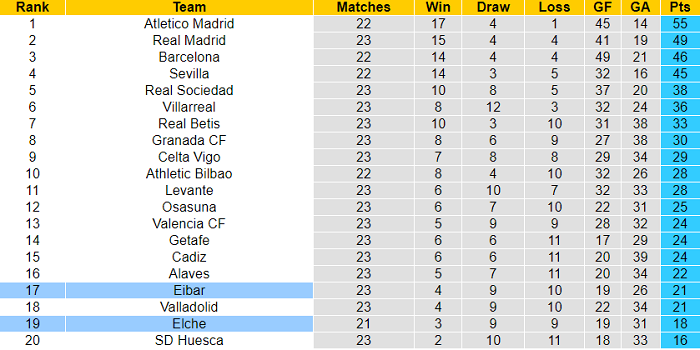 Tuy nhiên, Elche chưa cần quá lo lắng bởi dẫu sao thì La Liga 2020/21 vẫn còn tới 15 vòng đấu nữa mới hạ màn. Đấy là chưa kể Elche còn thi đấu ít hơn 2 trận so với nhóm đội xếp trên họ.