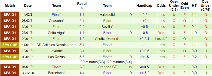 3/4 trận đấu gần nhất của Eibar thuộc khuôn khổ La Liga xuất hiện 2 bàn thắng. Kịch bản tương tự hứa hẹn lặp lại khi họ tái đấu Elche vào thứ Bảy (20/2).
