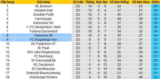Hiện tại Erzgebirge Aue đang hơn nhóm các đội cầm đèn đỏ tới 11 điểm, khoảng cách được coi là khá an toàn khi giải còn 11 vòng đấu nữa. Trong khi đó Hannover còn đang kém các đội Top 3 cũng đúng 11 điểm nên hầu như không có hy vọng trong cuộc đua giành 1 suất thăng hạng mùa này.