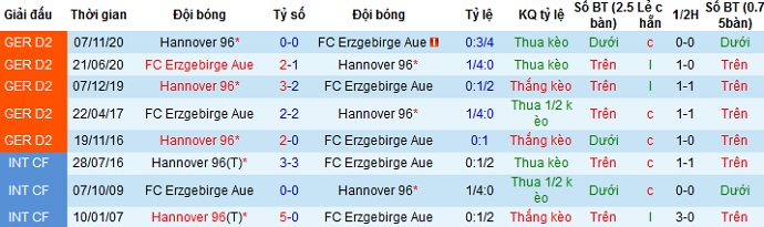 + Lịch sử đối đầu Erzgebirge Aue vs Hannover
