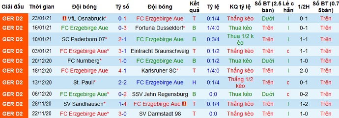 + Thống kê 10 trận gần nhất của Erzgebirge Aue