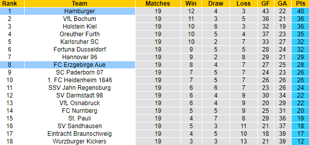 Trong khi đó, Erzgebirge không được đánh giá cao và họ cũng khó lòng cạnh tranh suất thăng hạng. Erzgebirge hiện xếp thứ 8, kém đối thủ đứng thứ 3 – đội được chơi trận play-off thăng hạng tới 8 điểm, cách biệt rất khó san lấp. Dẫu thế thì Erzgebirge cũng chẳng cần lo lắng, do đang hơn vị trí cầm đèn đỏ tới 10 điểm.