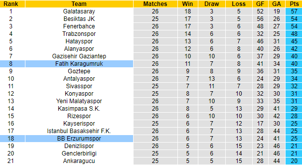 Erzurum BB đang được coi là ứng viên... xuống hạng tại giải VĐQG Thổ Nhĩ Kỳ. Sau 26 vòng đấu, Erzurum BB mới giành được 25 điểm, xếp thứ 18 trên bảng xếp hạng. Với số trận tương tự, Fatih Karagumruk đã giành 40 điểm, xếp ở vị trí thứ 8. Tuy nhiên ở trận đấu sắp tới đội bóng có thứ hạng thấp hơn lại được tin tưởng vào khả năng giành chiến thắng.