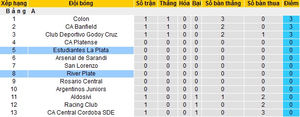 Bảng xếp hạng giải VĐQG Argentina vòng 1