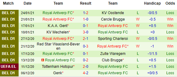 + Thống kê 10 trận gần nhất của Royal Antwerp