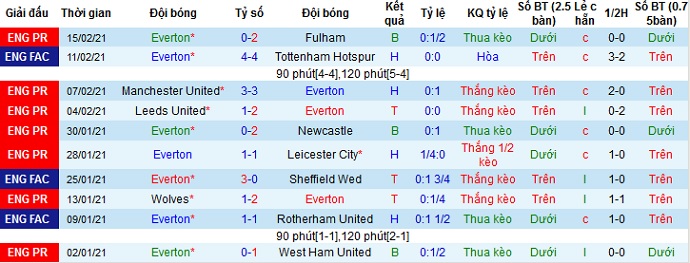 + Thống kê 10 trận gần nhất của Everton