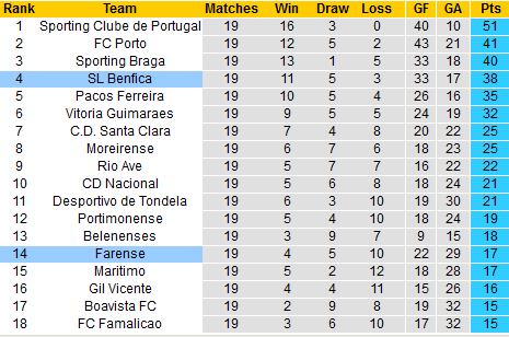Ngoài việc phải đối mặt với nhiều khó khăn như vậy, Benfica phải đến làm khách trên sân của đối thủ khó chịu như Farense. Đội chủ nhà vừa bất bại tới 5 trong 7 trận tiếp đón các đối thủ gần đây. Trận lượt đi ngay tại Da Luz cũng chứng kiến Farense chỉ thua sát nút 2-3.
