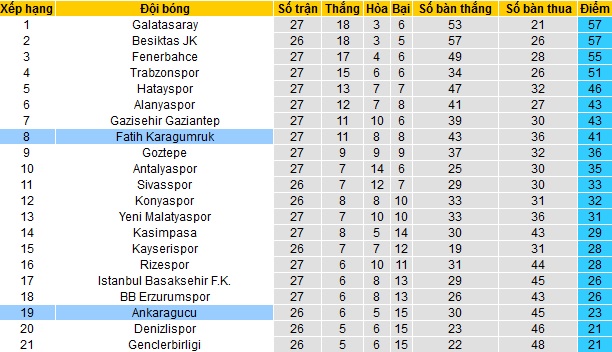 Bảng xếp hạng giải VĐQG Thổ Nhĩ Kỳ trước vòng 28