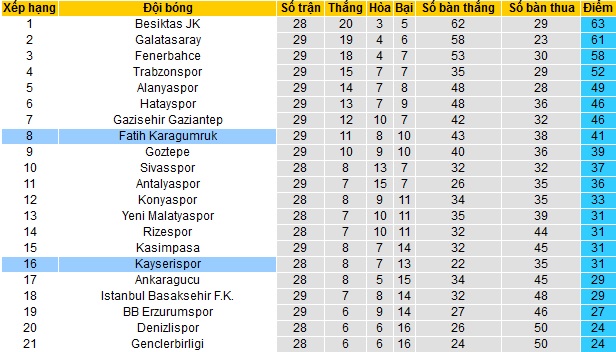 Trong khi đó Kayserispor hiện đã tụt xuống vị trí thứ 16 trên bảng xếp hạng và chỉ còn đứng trên nhóm cầm đèn đỏ có 2 bậc. Với 31 điểm có được sau 28 vòng đấu, Kayserispor chỉ có nhiều hơn đội đứng ngay sau cũng như cách nhóm cầm đèn đỏ đúng 2 điểm.