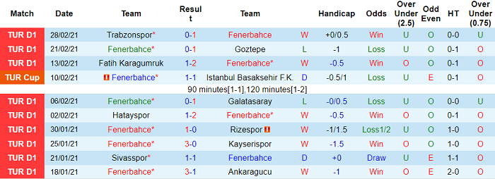 - Thống kê 10 trận gần nhất của Fenerbahce