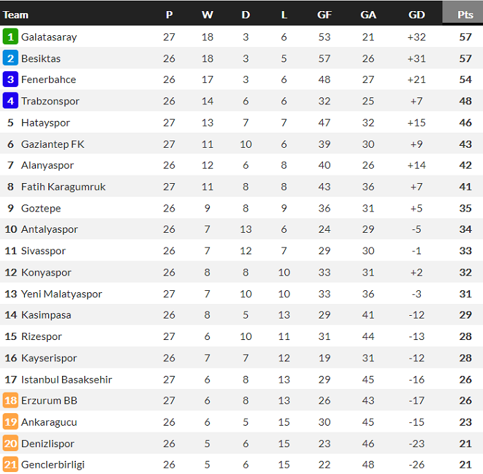 Bảng xếp hạng giải VĐQG Thổ Nhĩ Kỳ mới nhất