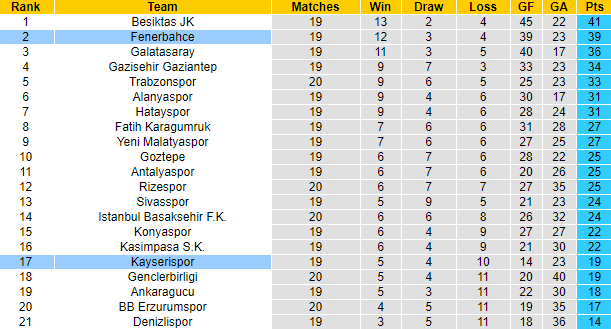 Fenerbahce đang xếp thứ 2 trên bảng xếp hạng giải VĐQG Thổ Nhĩ Kỳ mùa này với 39 điểm sau 19 trận, chỉ kém đội đầu bảng Besiktas 2 điểm. Trong khi đó với số trận tương tự, Kayserispor mới giành được 19 điểm, xếp ở vị trí thứ 17. Cùng với việc được thi đấu trên sân nhà, Fenerbahce hoàn toàn xứng đáng được đánh giá cao vào khả năng giành chiến thắng.