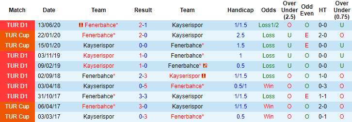 Phong độ và thống kê đối đầu Fenerbahce vs Kayserispor