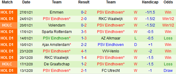 + Thống kê 10 trận gần nhất của PSV Eindhoven