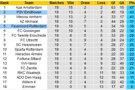 Như thường lệ, cuộc đua vô địch tại sân chơi bóng đá Hà Lan diễn ra giữa Ajax và phần còn lại. Trong đó PSV Eindhoven là cái tên khó chịu nhất lúc này khi đang đứng nhì bảng với 4 điểm ít hơn sau 19 vòng.