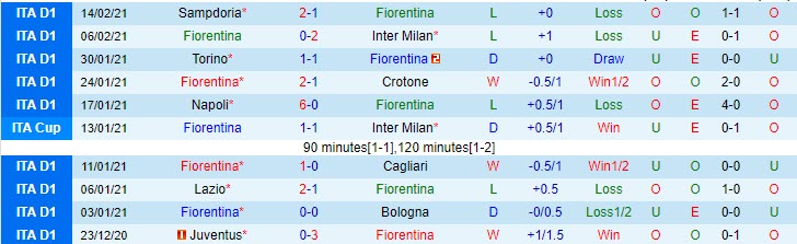 + Thống kê 10 trận gần nhất của Fiorentina