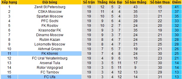 Trong khi đó FK Ufa hiện đang đứng áp chót bảng xếp hạng khi mới chỉ có được 13 điểm sau 19 vòng đấu, bằng điểm với đội bét bảng Tambov nhưng hơn về hiệu số bàn thắng và đang thi đấu ít hơn 1 trận. Khoảng cách của FK Ufa đến nhóm trụ hạng hiện cũng đang là 8 điểm.