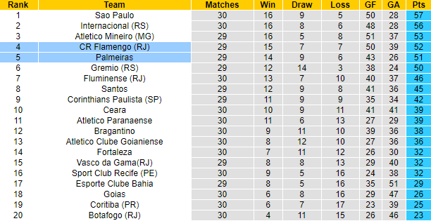 Flamengo bất bại cả 3 trận đối đầu Palmeiras gần đây với 2 chiến thắng và 1 trận hòa. Lần gần nhất tiếp đón Palmeiras trên sân nhà, Flamengo giành chiến thắng thuyết phục với tỷ số 3-0. Trên bảng xếp hạng Brazil lúc này, Flamengo cũng đang xếp trên Palmeiras 1 bậc. Cụ thể, Flamengo đang xếp thứ 4 với 52 điểm, Palmeiras xếp thứ 5 với 51 điểm.
