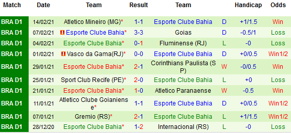 + Thống kê 10 trận gần nhất của Bahia
